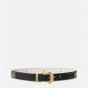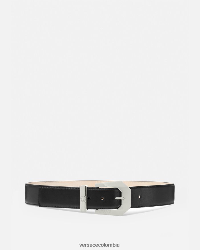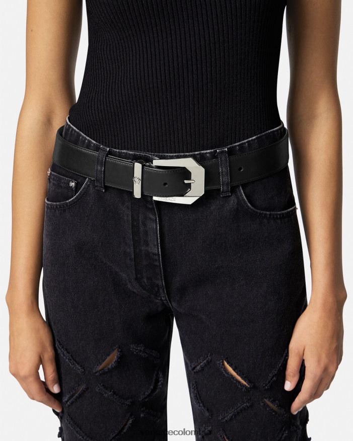 Este cinturón de cuero presenta una hebilla tradicional de Medusa con una presilla con tachuelas de Medusa acentuada.