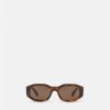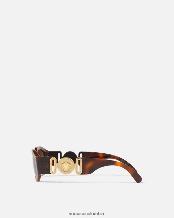 Gafas de sol que evocan el estilo opulento de un ícono del hip-hop con una atrevida forma de lente baja y patillas anchas adornadas con un medallón de medusa tradicional en tono dorado. en una elegante combinación de una gruesa montura habana y lentes marrones.