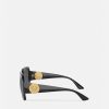 Gafas de sol geométricas de carey con un emblema de medusa en el lateral.