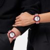 - pulsera: correa de pu rosa transparente con trabilla metálica con greca a las 6 h y hebilla con lengüeta