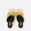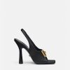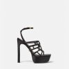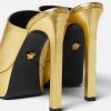 Estas mules con plataforma están confeccionadas en cuero con un acabado metálico. Tienen tacones altos de aguja con una placa de medusa en la parte delantera.