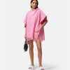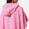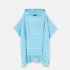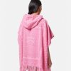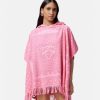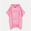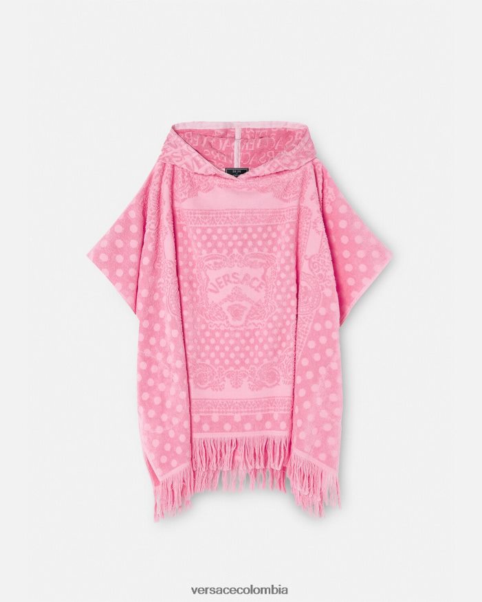 versace presenta dua lipa x versace, una colección cápsula codiseñada con dua lipa. Este pareo de playa con capucha tiene un diseño de poncho con ribetes de flecos, con mariposas y mariquitas tonales y patrones duales de Versace en una textura de toalla.