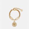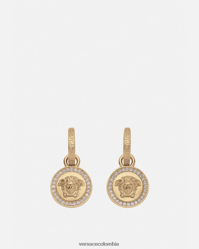 Aretes colgantes adornados con cristales con dijes de la medusa y grabados de greca. Todos los productos de joyería de Versace no contienen plomo ni níquel. Todos los materiales son hipoalergénicos.