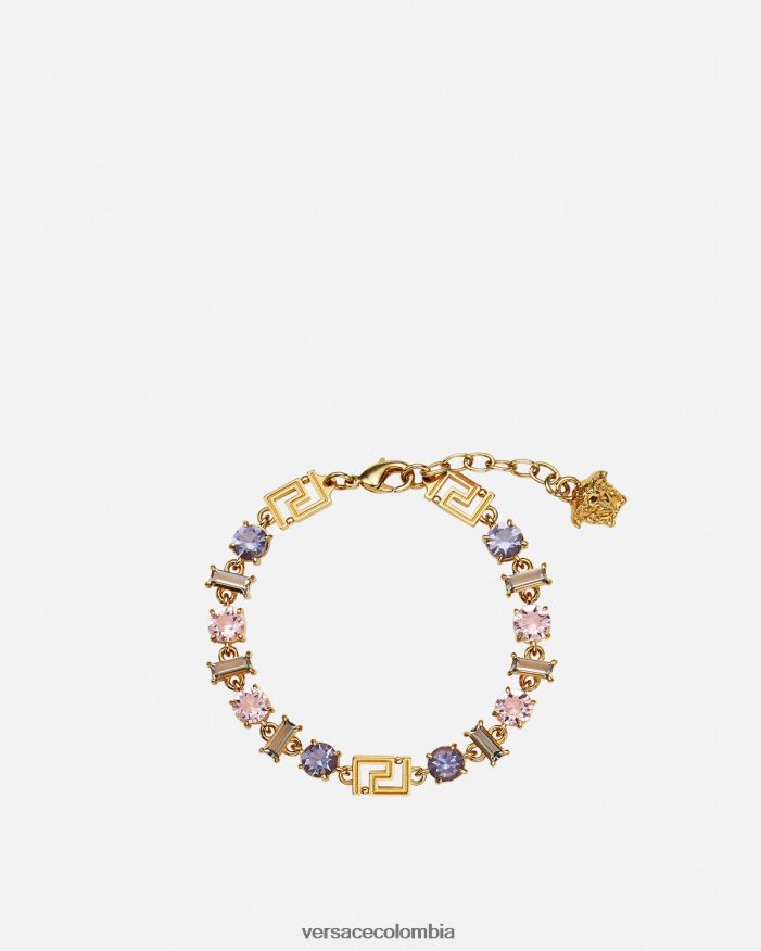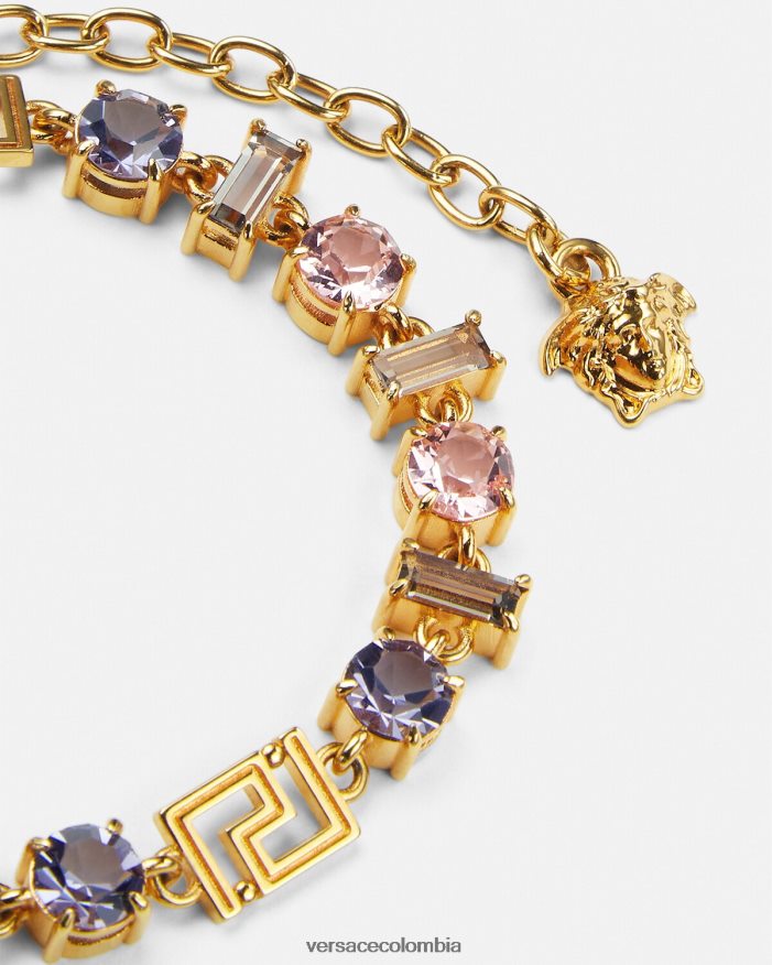 una pulsera de cadena ajustable con cristales multicolores y eslabones de greca. Todos los productos de joyería de Versace no contienen plomo ni níquel. Todos los materiales son hipoalergénicos.