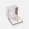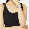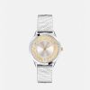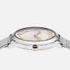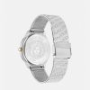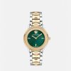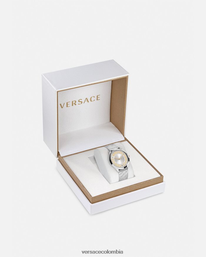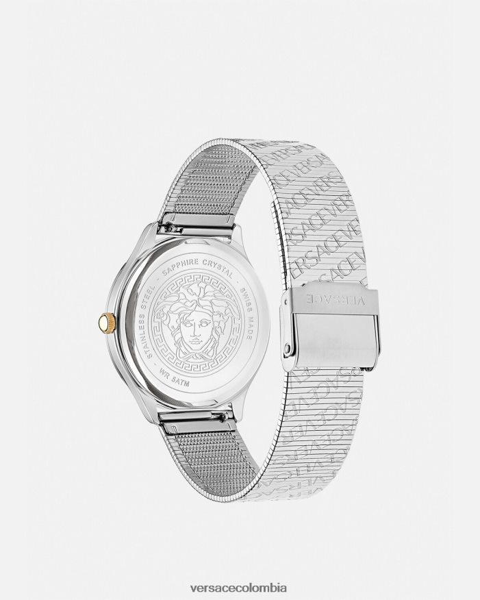 Este reloj presenta un anillo de la “logomanía de Versace Versace” en una esfera plateada con detalles en tono dorado. El diseño versátil se realza con una delgada caja de acero inoxidable y una pulsera de malla metálica con el logotipo de Versace grabado.
