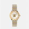 El reloj femenino revisita la medusa flotante tridimensional en una iteración transparente. la esfera está enriquecida con un motivo de greca tonal en el anillo interior. Todos los relojes Versace están garantizados por la marca “fabricación suiza”.