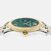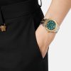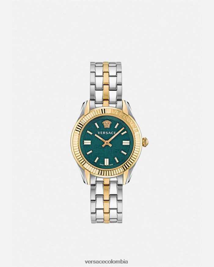 Este reloj moderno se caracteriza por un anillo grabado con las letras Versace. la esfera presenta un patrón de greca tonal, un logotipo en contraste y un emblema de medusa tridimensional. La banda de metal presenta eslabones centrales con Greca grabada y está rematada con un cierre de hebilla de mariposa y pulsadores. Todos los relojes Versace están garantizados por la marca “fabricación suiza”.