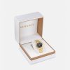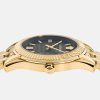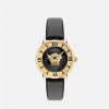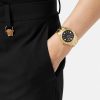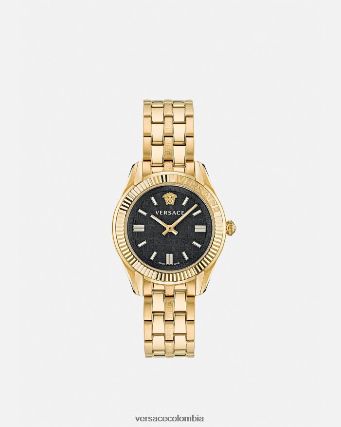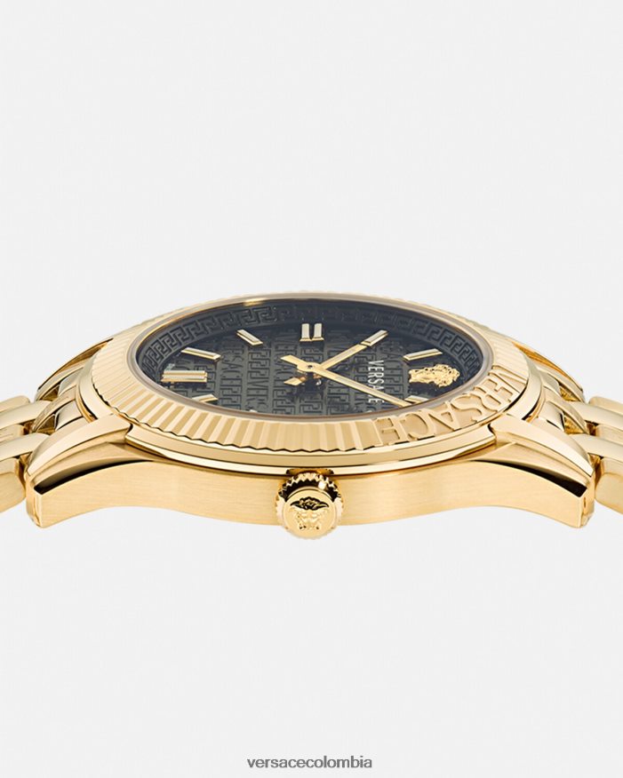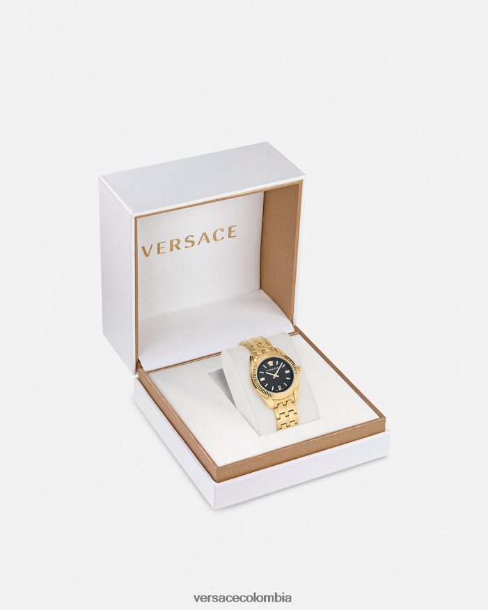 Este reloj moderno se caracteriza por un anillo grabado con las letras Versace. la esfera presenta un patrón de greca tonal, un logotipo en contraste y un emblema de medusa tridimensional. La banda de metal presenta eslabones centrales con Greca grabada y está rematada con un cierre de hebilla de mariposa y pulsadores. Todos los relojes Versace están garantizados por la marca “fabricación suiza”.