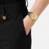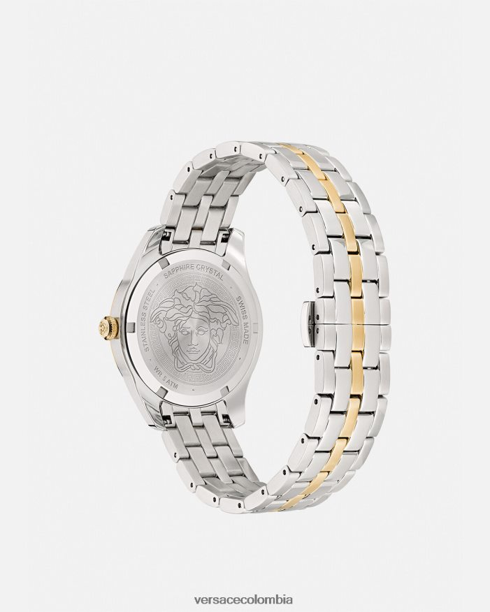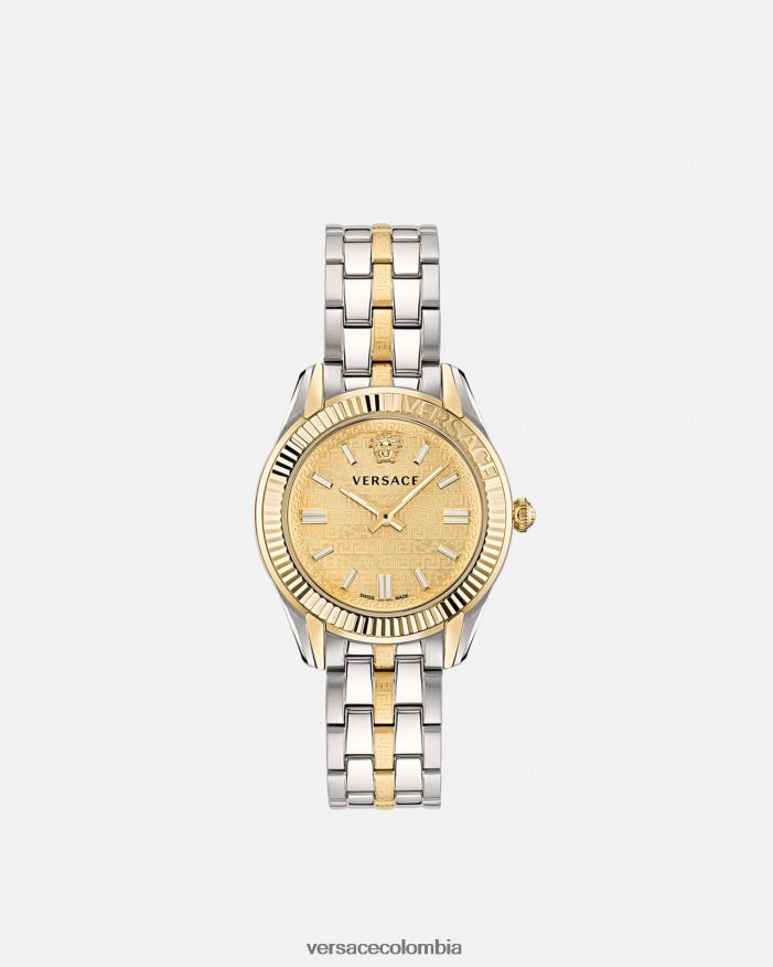 - esfera: esfera de acero inoxidable y color champán con letras de Versace y motivo de greca