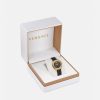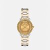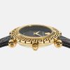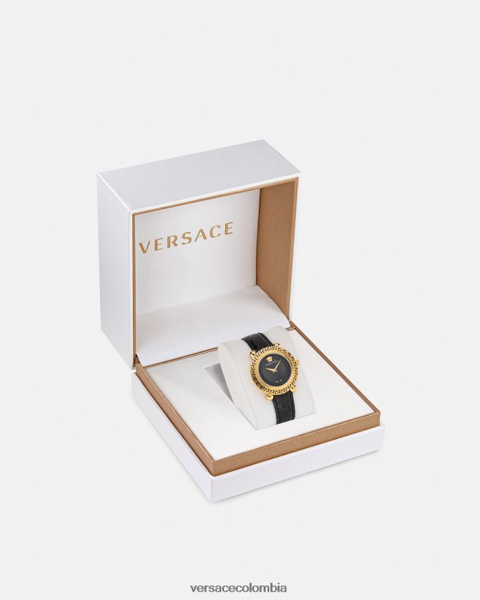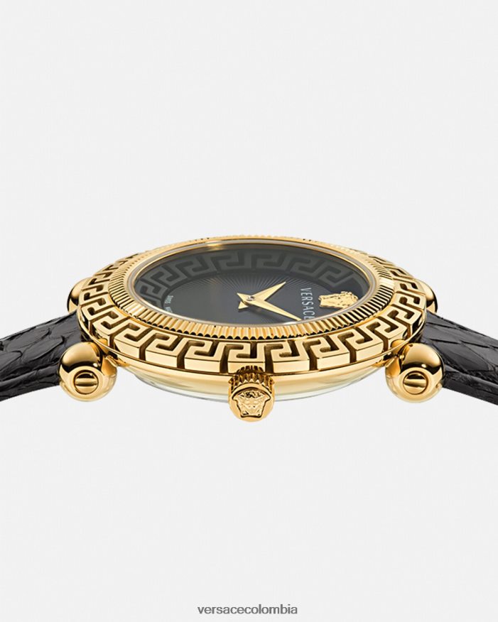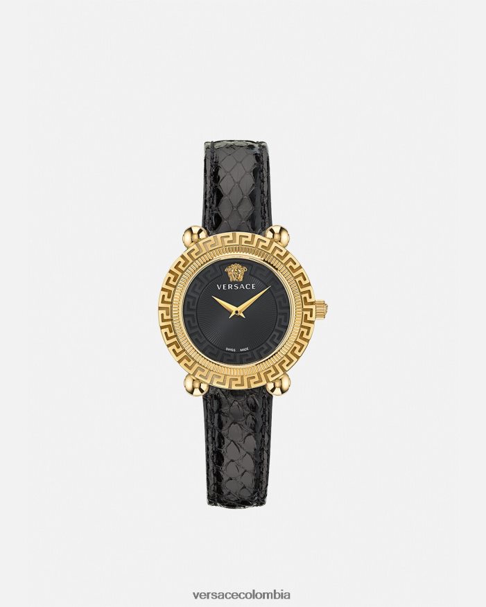 un reloj detallado con símbolos de la marca, incluida la medusa tridimensional a las 12 en punto y el motivo de greca en la parte superior y en el anillo interior. El accesorio se completa con una correa de piel de serpiente elaphe. Todos los relojes Versace están garantizados por la marca “fabricación suiza”.