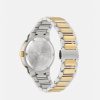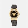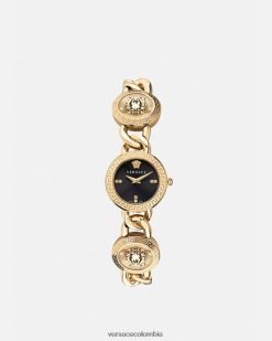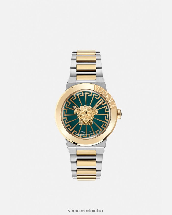 Este elegante reloj presenta una medusa tridimensional engastada entre dos cristales con un sistema de movimiento de dos manecillas. un patrón de asa de greca aparece en la esfera interior, mientras que una letra de Versace grabada en el anillo enmarca la caja. El accesorio está acabado con una banda de metal.