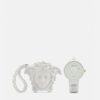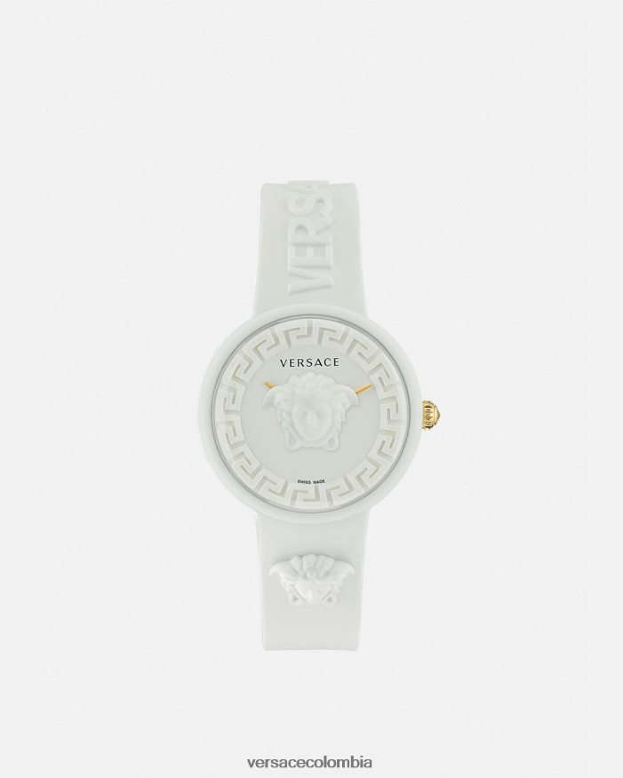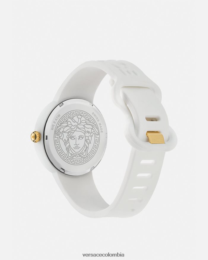 un reloj moderno en ricos colores pop detallados con símbolos tonales de Versace que incluyen una medusa tridimensional, un anillo interior de greca y letras de Versace en la banda de silicona. El accesorio se entrega en una bolsita de silicona a juego. Todos los relojes Versace están garantizados por la marca “fabricación suiza”.