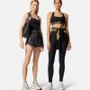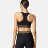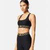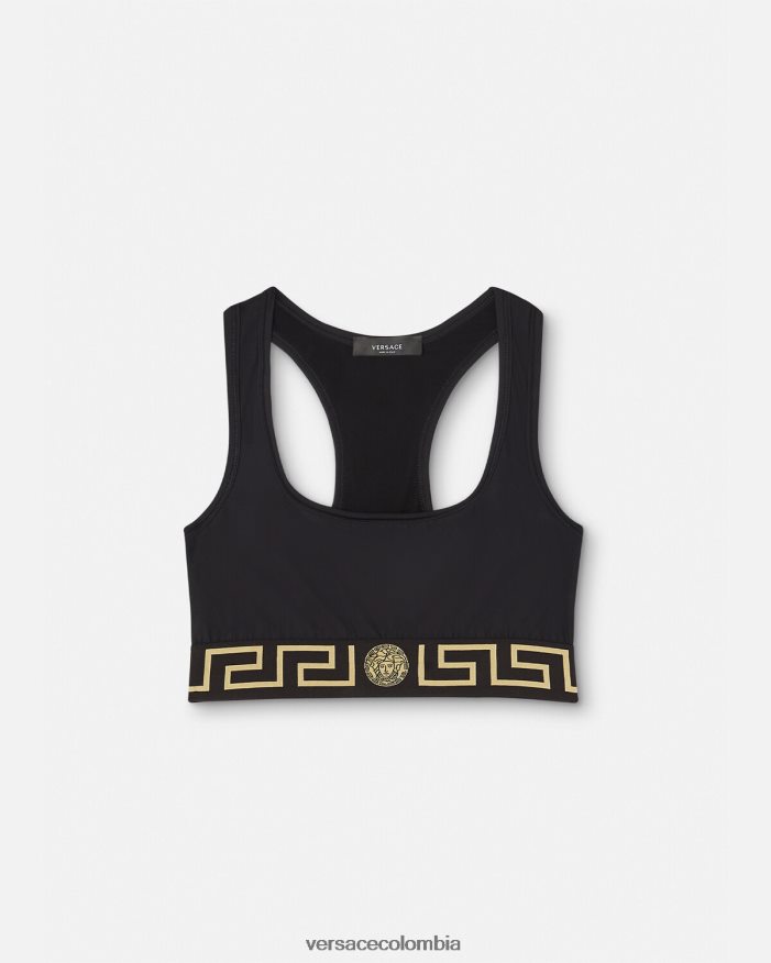 Este sujetador deportivo con cuello redondo y espalda nadadora presenta el característico borde de Greca en la cinturilla elástica.