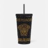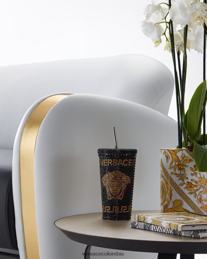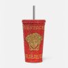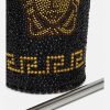 un vaso de viaje de acero inoxidable adornado con cristales y pajita para bebidas frías con motivos de medusa y logotipos.