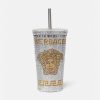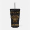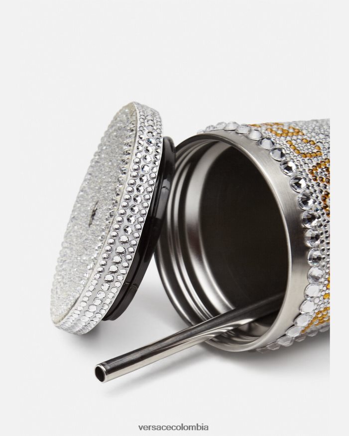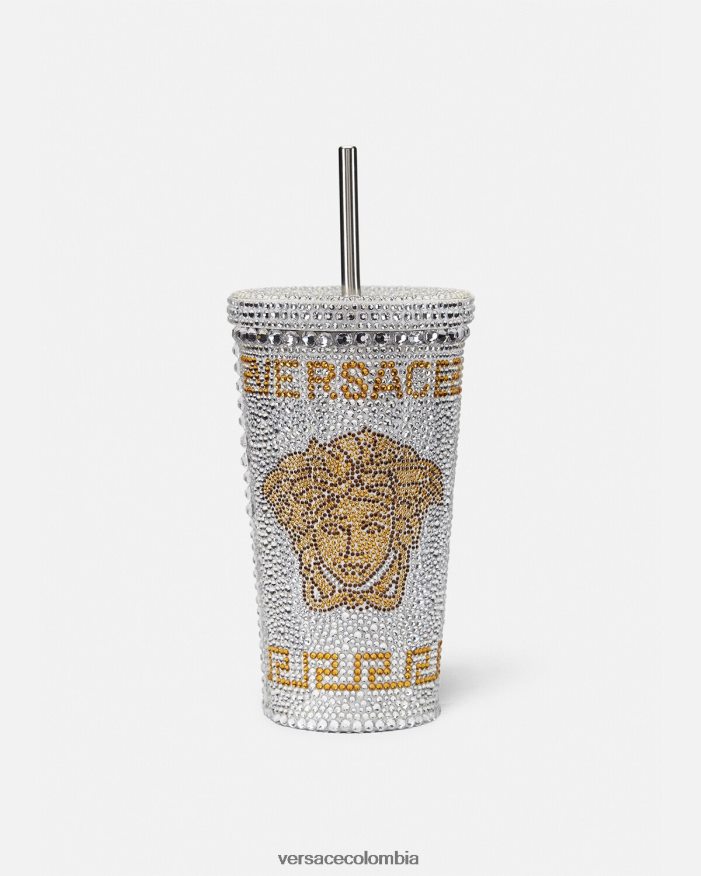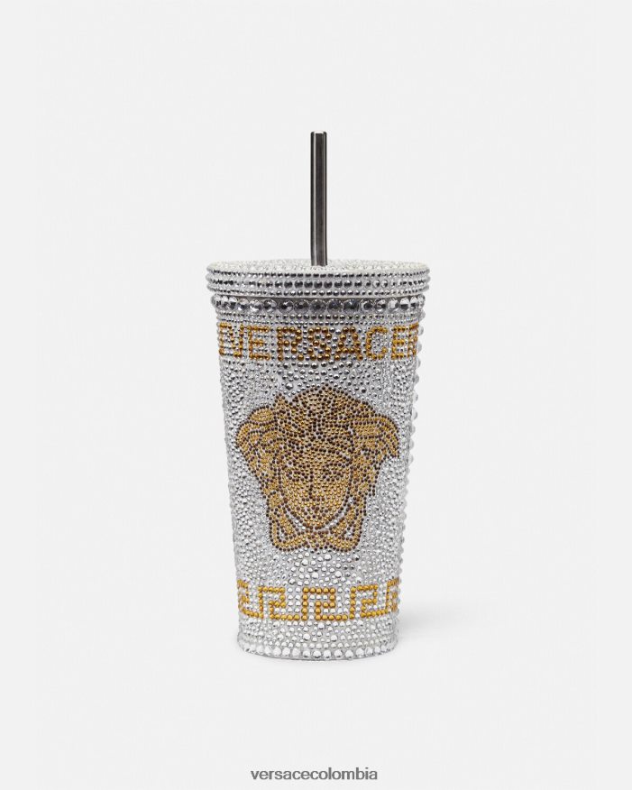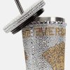 un vaso de viaje de acero inoxidable adornado con cristales y pajita para bebidas frías con motivos de medusa y logotipos.