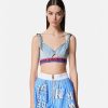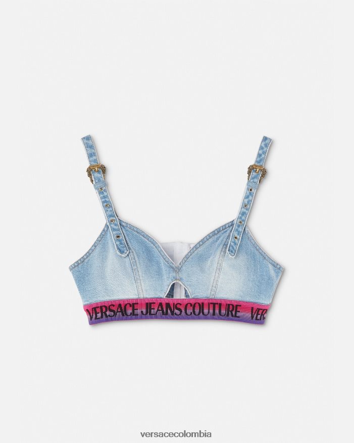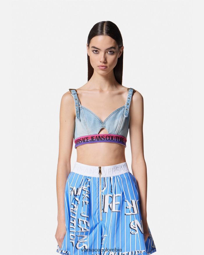 un top de mezclilla corto, con correas ajustables con hebillas barrocas y una cinturilla con logo.