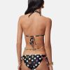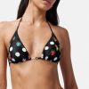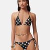 versace presenta dua lipa x versace, una colección cápsula codiseñada con dua lipa. Este top de bikini triangular de lunares presenta un estampado de mariposas y mariquitas con detalles metálicos de medusa. Este diseño de ropa de playa se puede combinar con una braguita de bikini con el estampado a juego.