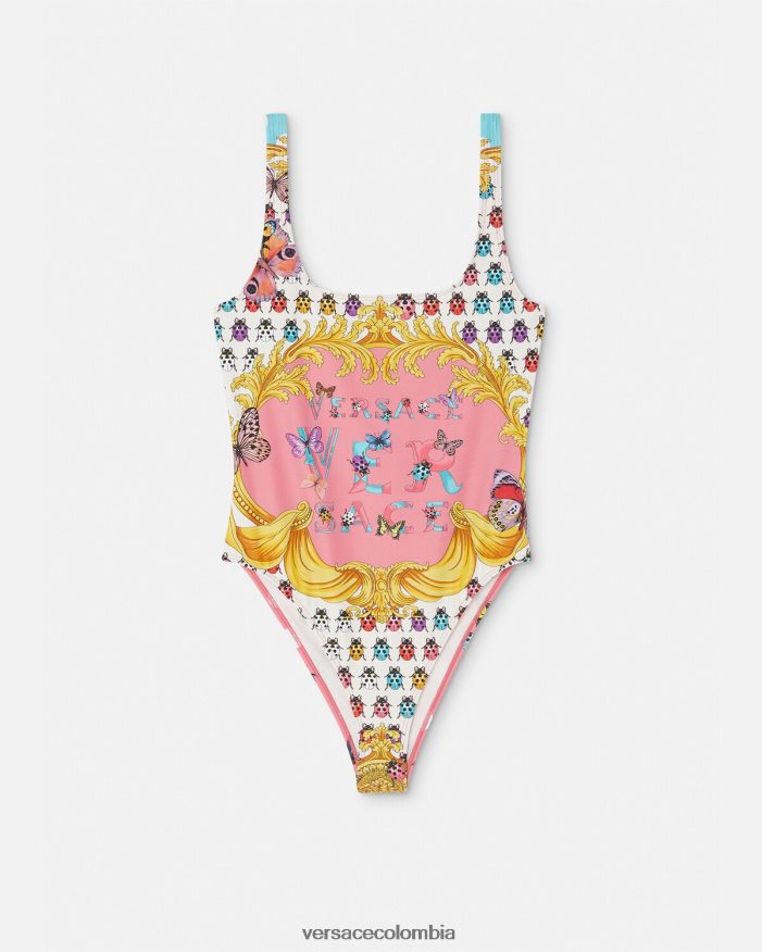 Este traje de baño de una pieza presenta el estampado tradicional de mariposas y mariquitas, y tiene escote cuadrado y espalda escotada.