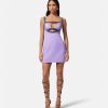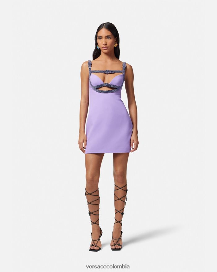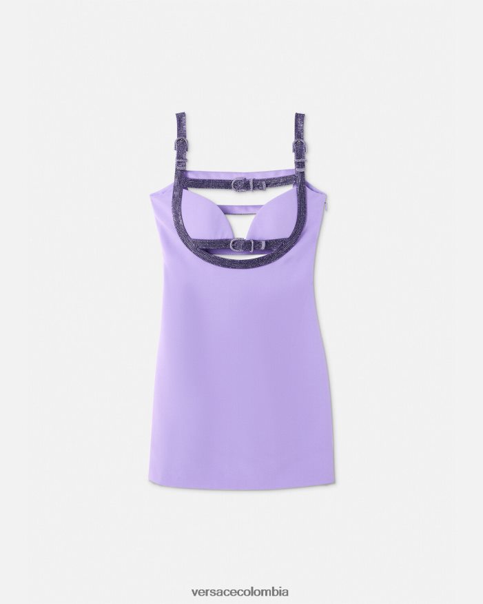 versace presenta dua lipa x versace, una colección cápsula codiseñada con dua lipa. Este minivestido recortado tiene una silueta ajustada con ribetes adornados con cristales y cierres de hebilla.