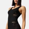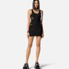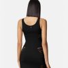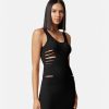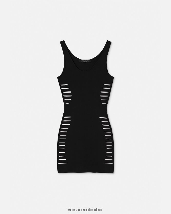Este minivestido de punto sin mangas presenta cortes cortados con láser en los costados, mostrando la forma en una silueta elástica y ajustada. una única tachuela de medusa acentúa la espalda.