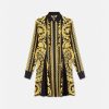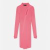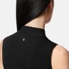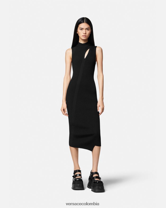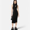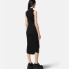 un vestido midi sin mangas y asimétrico con cuello alto acanalado, abertura frontal, costuras torcidas diagonales y una pequeña tachuela de medusa en la parte posterior.