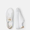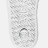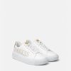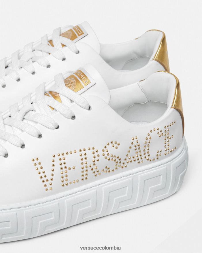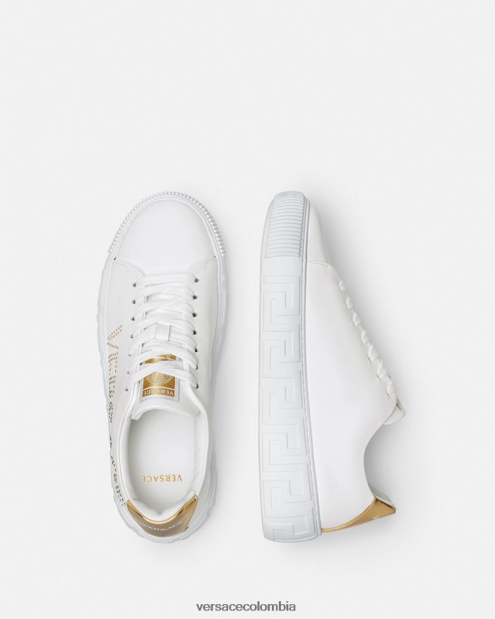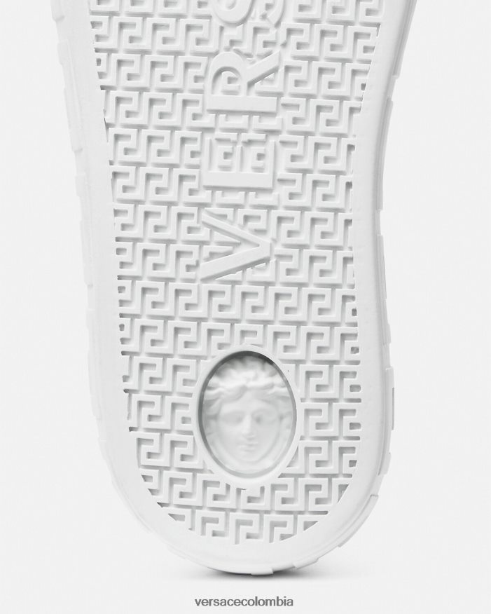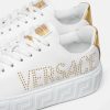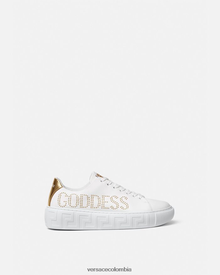 La silueta de caña baja se caracteriza por un patrón de greca grabado sobre suelas de goma vulcanizada, con las palabras “versace” y “diosa” tachonadas en los laterales. un sello con el logotipo en la parte trasera acentúa el estilo con cordones.