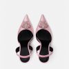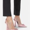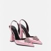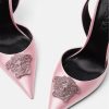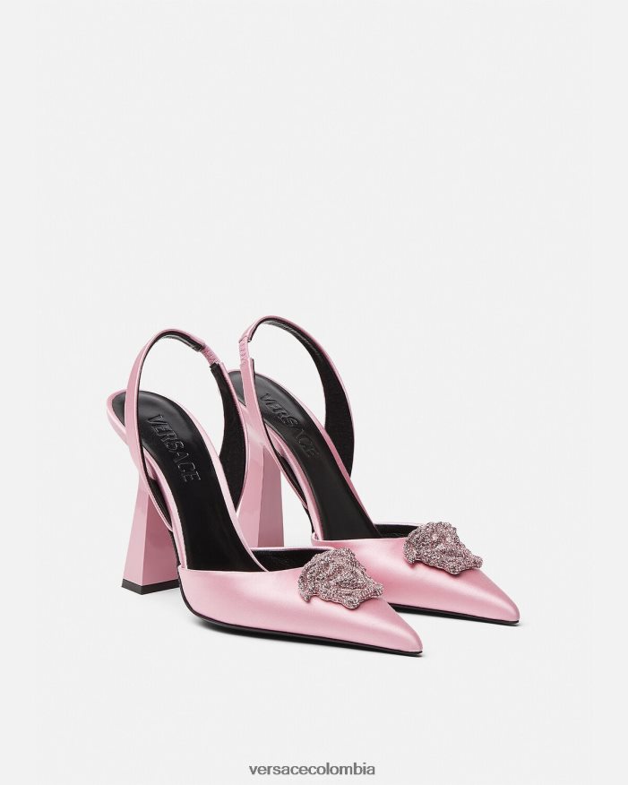 Estos zapatos destalonados, elegantes y sin esfuerzo, están confeccionados en satén suave. la elegante silueta de punta puntiaguda está adornada con una placa de medusa con incrustaciones de cristales, la decoración icónica que se encuentra en las puertas de la primera sede de la marca en Milán.