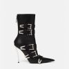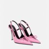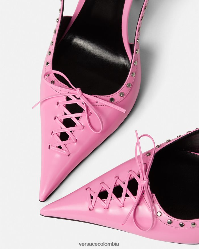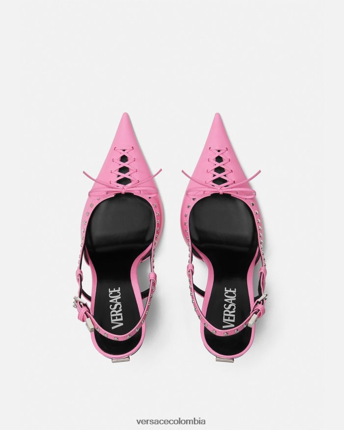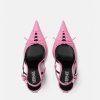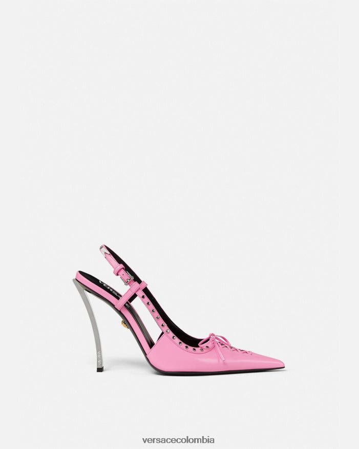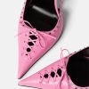 Estos zapatos de tacón de cuero con tira trasera se caracterizan por tener tacones de aguja altos y curvos. Con puntera puntiaguda, están acentuados por tachuelas y detalles de cordones en la parte superior.