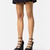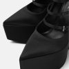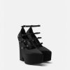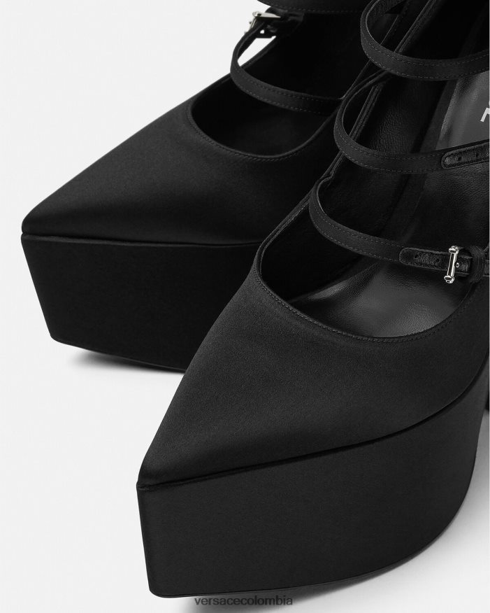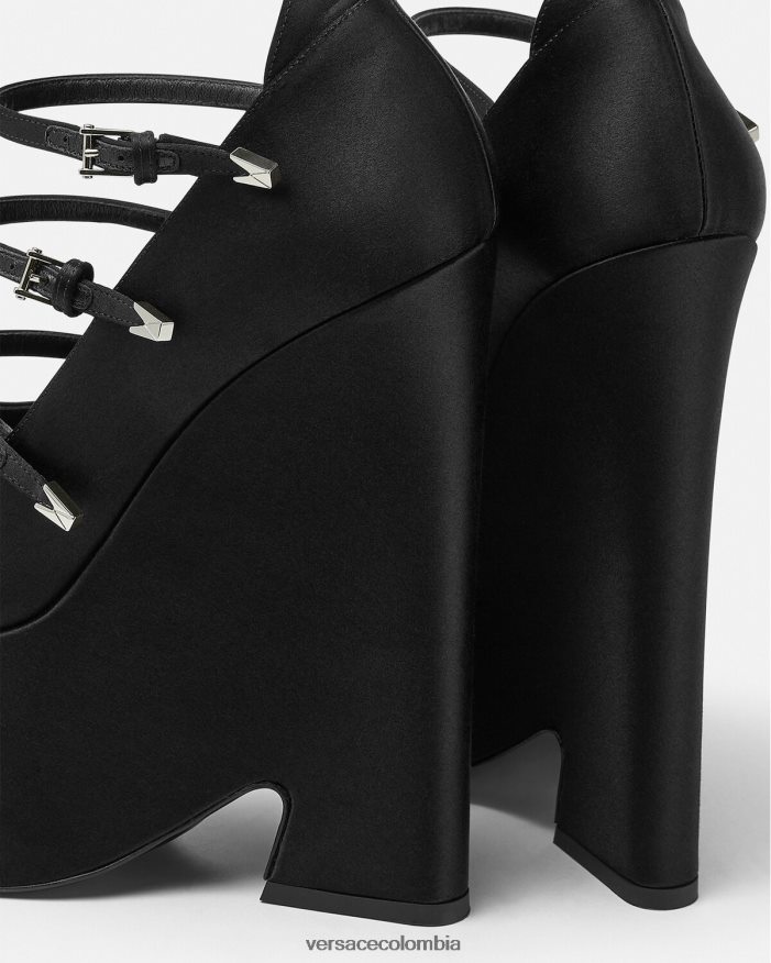 Estos llamativos zapatos de tacón en punta de Versace se definen por un tacón de plataforma con muescas en forma de onda. Los herrajes en forma de V en las correas de las hebillas acentúan la parte superior de satén.