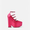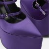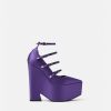 Estos llamativos zapatos de tacón en punta de Versace se definen por un tacón de plataforma con muescas en forma de onda. Los herrajes en forma de V en las correas de las hebillas acentúan la parte superior de satén.