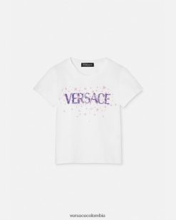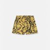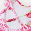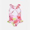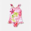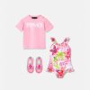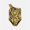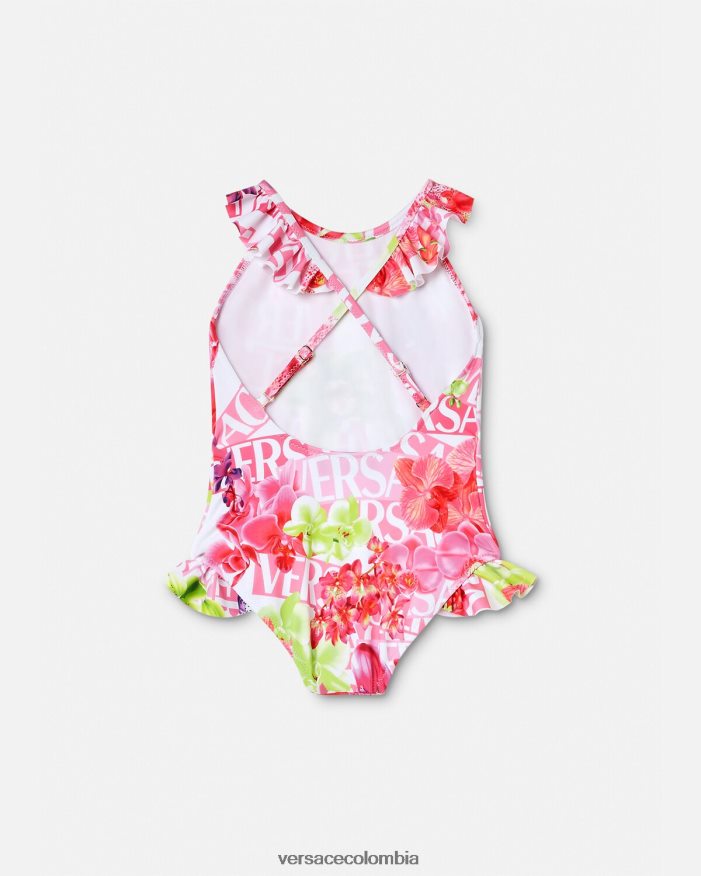 un precioso diseño de trajes de baño para días divertidos en la piscina o la playa, con un estampado de orquídeas para niños con el logotipo de Versace y ribetes con volantes.