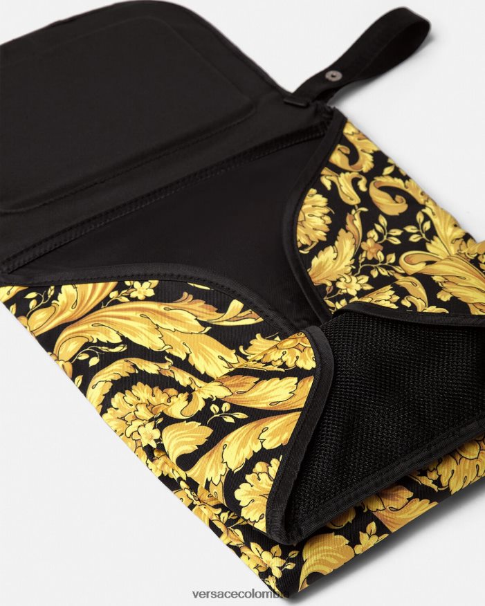 Este cambiador portátil es un práctico accesorio para los padres. Presenta un estampado infantil barroco en toda su extensión, una cómoda correa para la muñeca y compartimentos interiores diseñados para guardar pañales, toallitas húmedas y otros elementos esenciales.