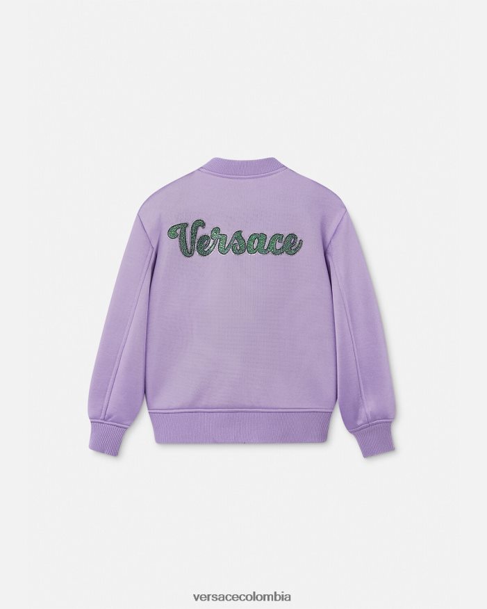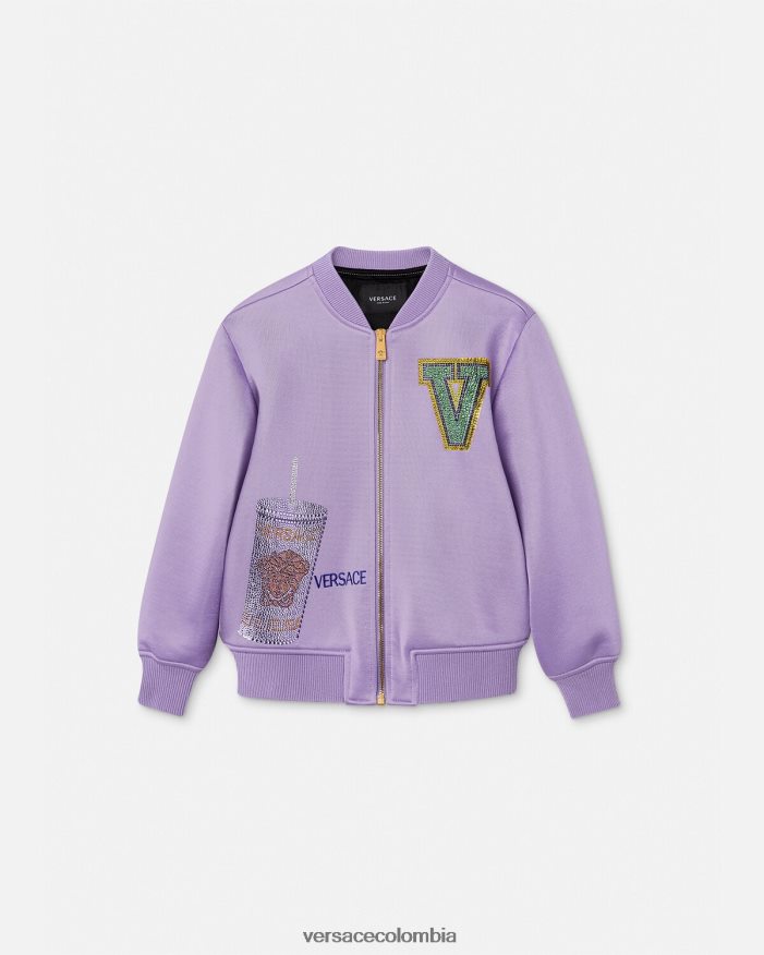 Esta chaqueta bomber de neopreno para los más pequeños está detallada con un logotipo de Versace adornado con cristales y un motivo de taza de viaje, símbolos orgullosos de pertenecer a la familia Versace.