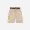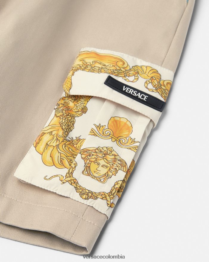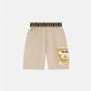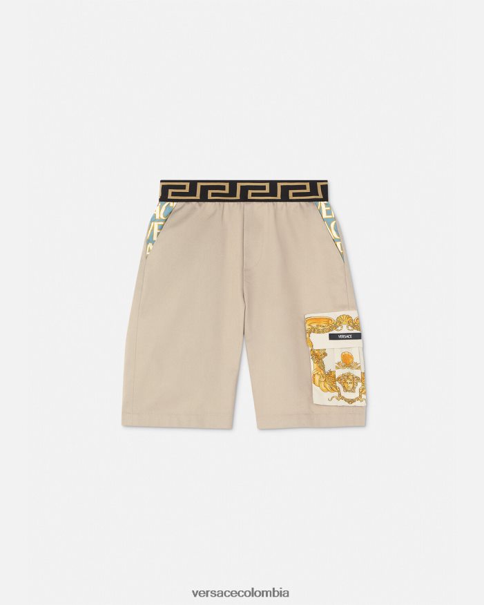 Estos pantalones cortos cuentan con la distintiva cinturilla elástica con borde de Greca y están detallados con paneles estampados Versace para niños en toda la prenda y un bolsillo cargo con estampado barroco de conchas marinas para niños.