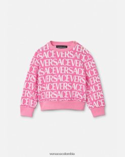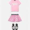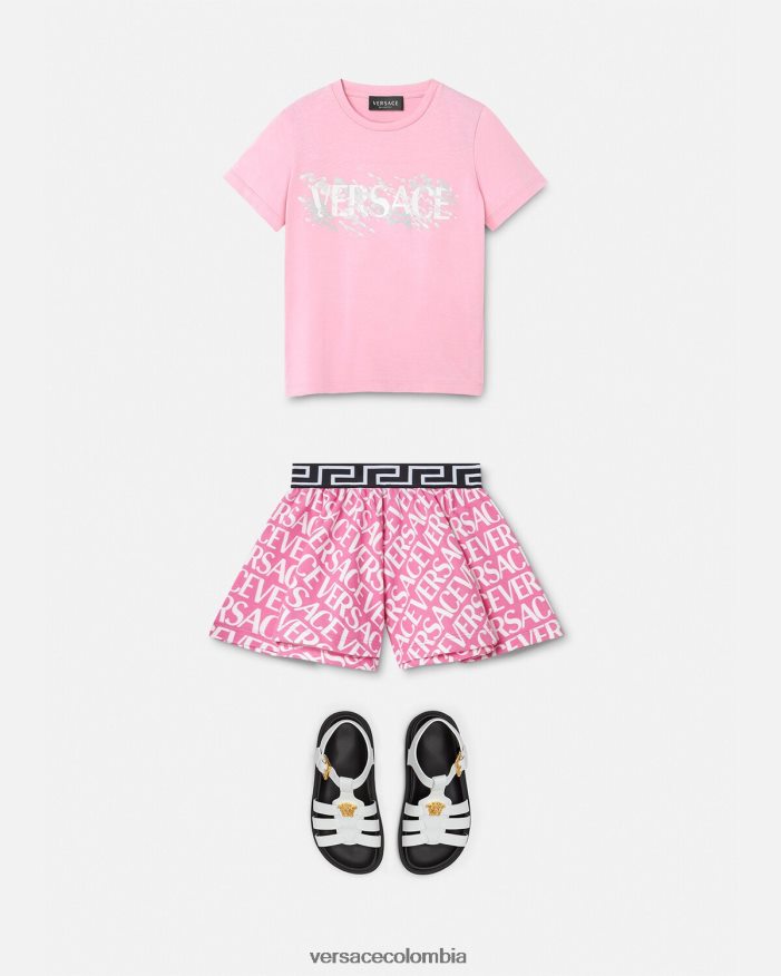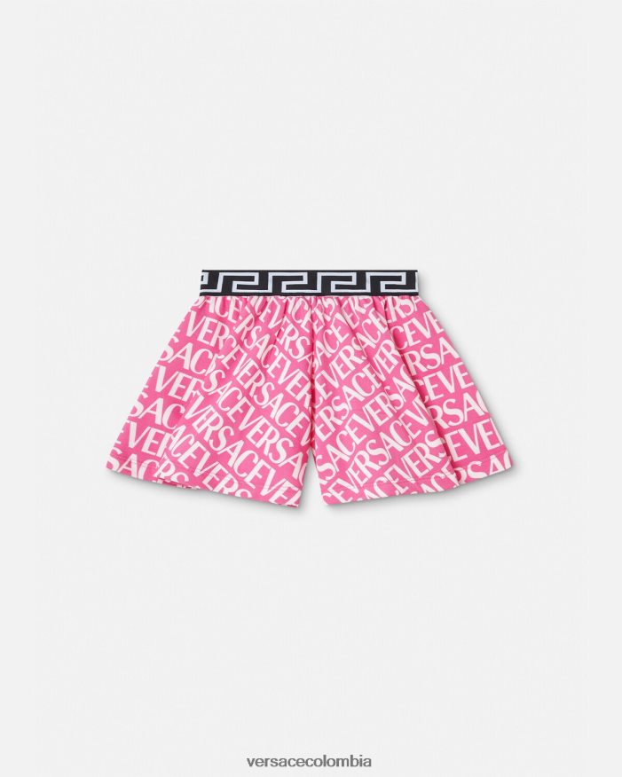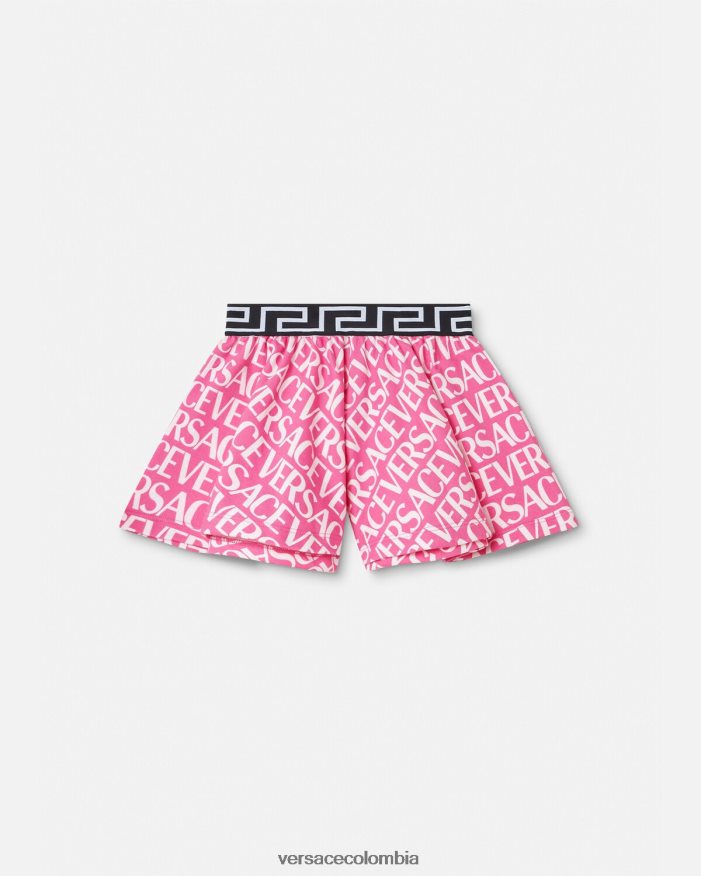 El logotipo de Versace para niños en toda la prenda se ha reducido para los más pequeños con estos pantalones cortos deportivos acampanados, completos con una cinturilla con borde de Greca.