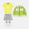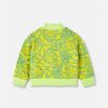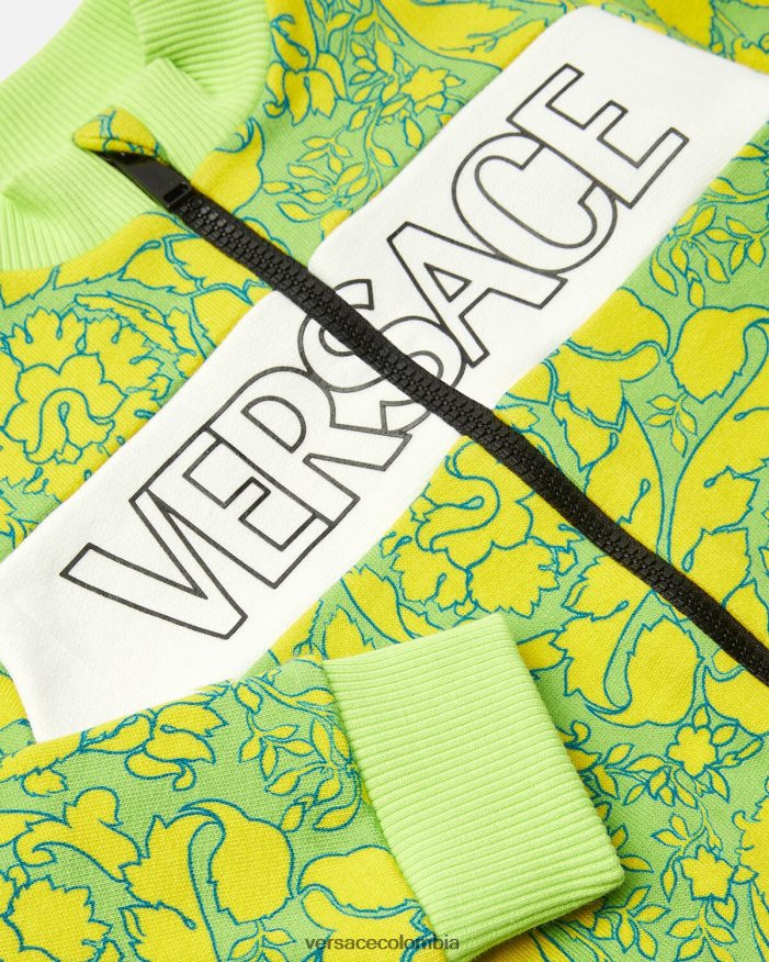 una sudadera de punto de algodón con cremallera que presenta un estampado mini-yo con siluetas estampadas del estampado barroco y un logo de versace kids en el frente.