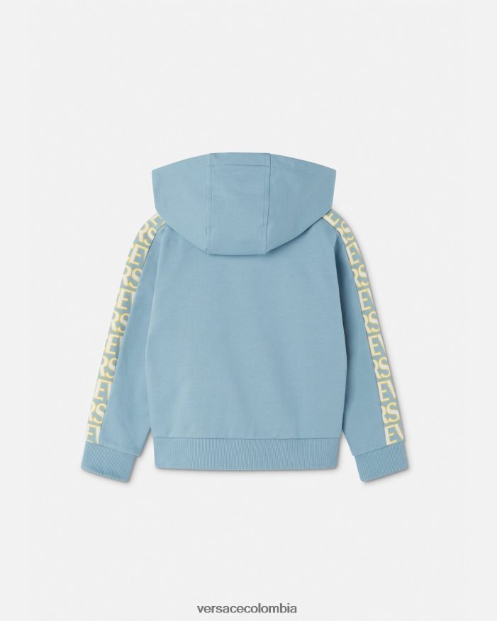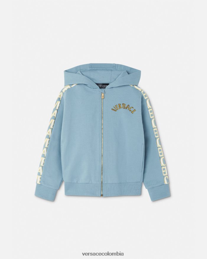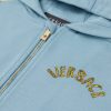 una sudadera con capucha y cremallera confeccionada con punto de algodón y que presenta un logotipo de Versace bordado y un estampado de Versace Kids en contraste en las mangas.