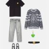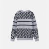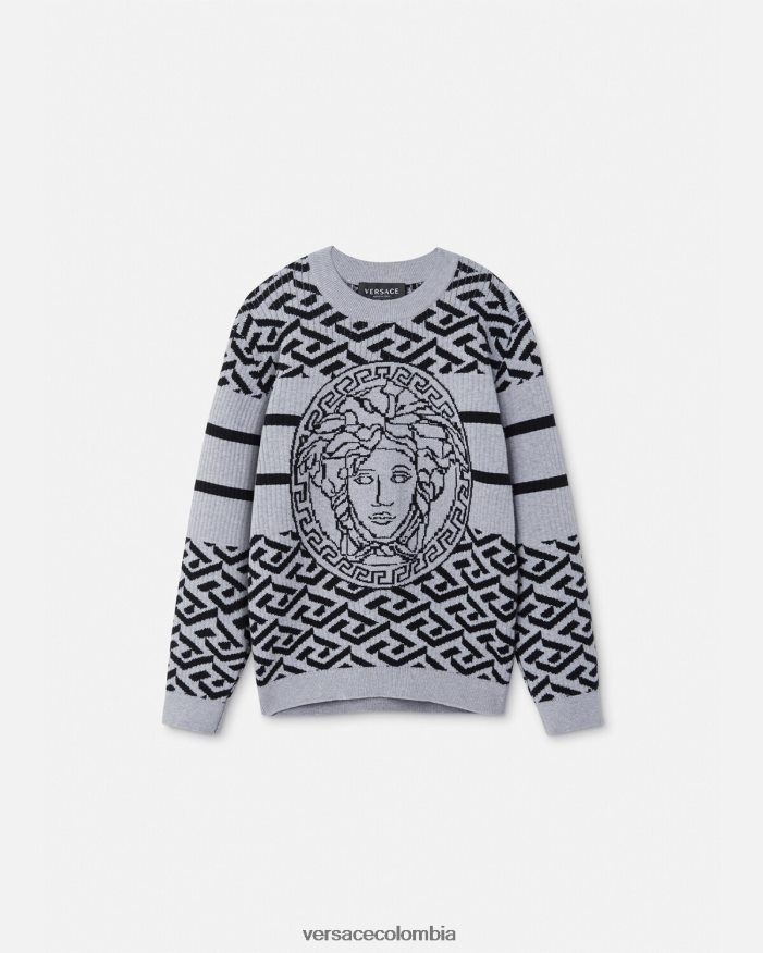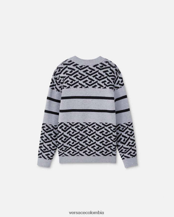 Este suéter de cuello redondo, tejido en jacquard, presenta un motivo infantil de La Greca y Medusa en la parte delantera y ribetes acanalados.