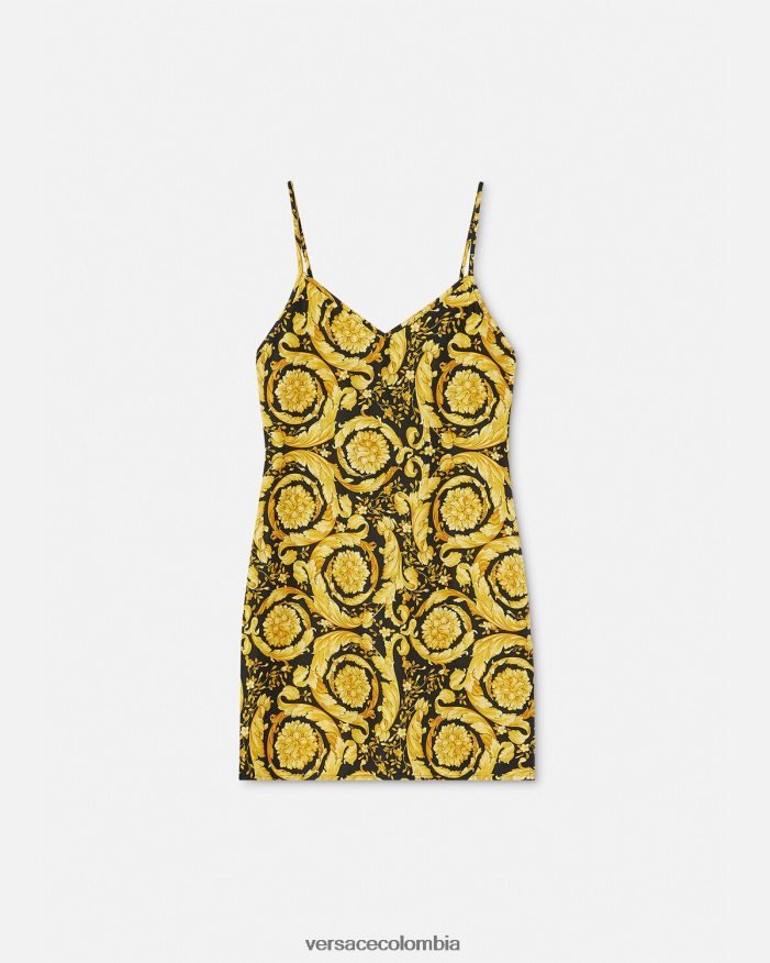 Este vestido tipo pijama, confeccionado en sarga de seda, presenta un estampado barroco por toda la prenda.