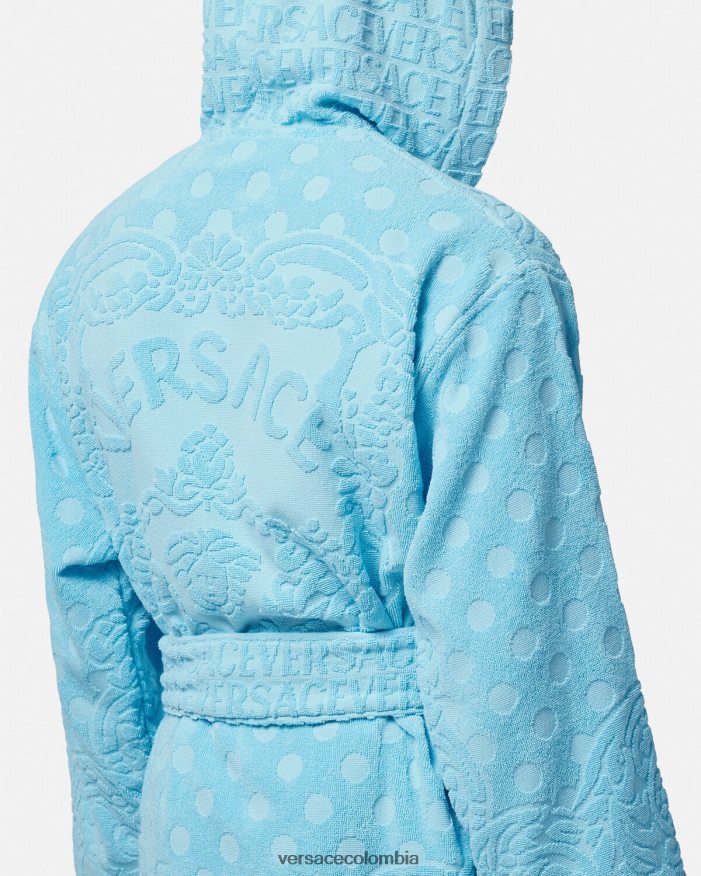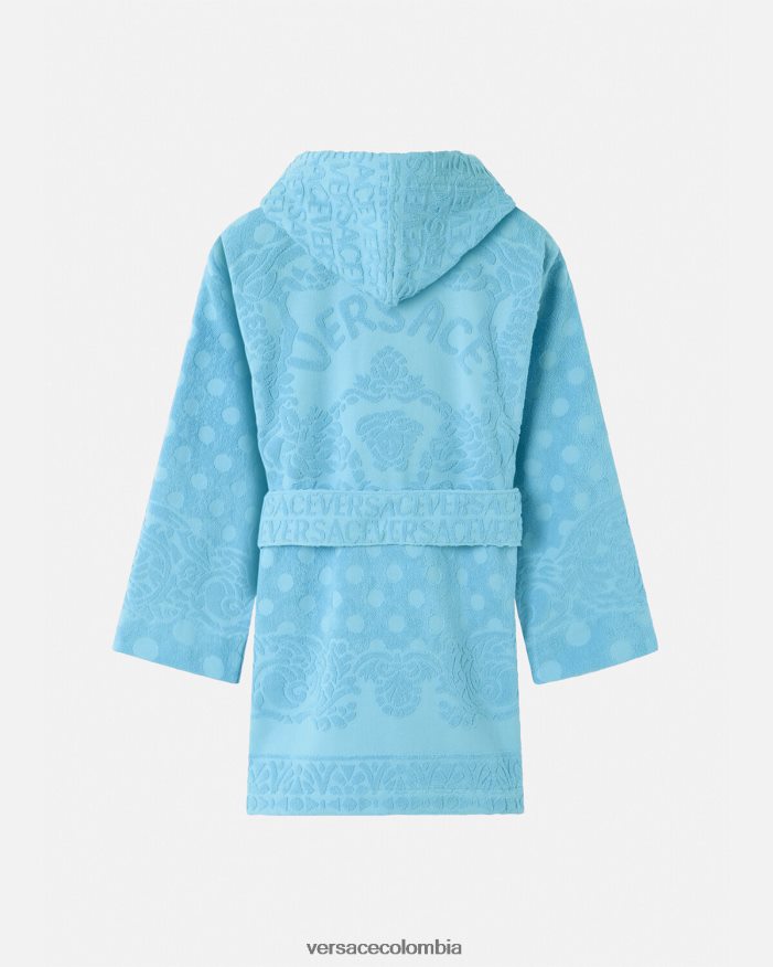 Este albornoz corto está confeccionado con una suave toalla de felpa con un motivo de lunares barrocos de conchas marinas en el mismo tono y una capucha. El diseño se detalla con un patrón integral de Versace tonal en el reverso y en el cinturón anudado.