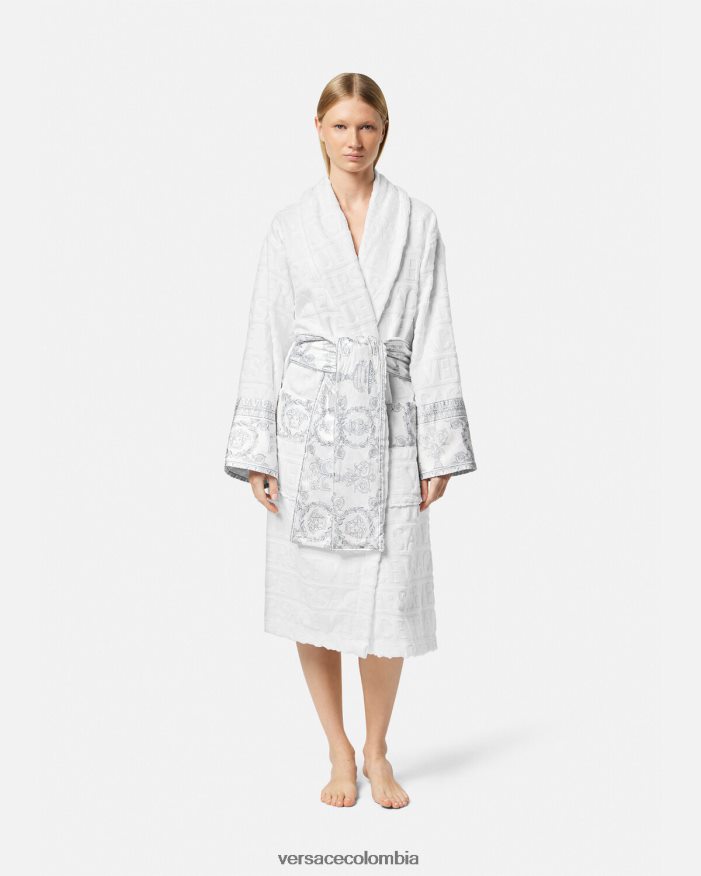 Esta bata de baño larga de algodón de rizo presenta un estampado integral de jacquard tonal de Versace. El albornoz de novia adornado con cristales se puede combinar con el albornoz de novio a juego para una ocasión especial de boda. El estilo loungewear se detalla con mangas con estampado barroco en el mismo tono y un cinturón anudado.