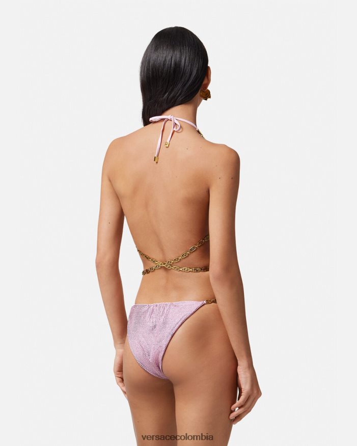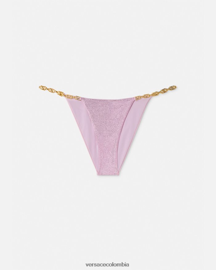 versace presenta dua lipa x versace, una colección cápsula codiseñada con dua lipa. Estas braguitas de bikini cuentan con adornos de cristal tonales y una cadena de greca a los lados y detalles fruncidos en la parte posterior. El estilo de traje de baño se puede combinar con el top de bikini a juego.