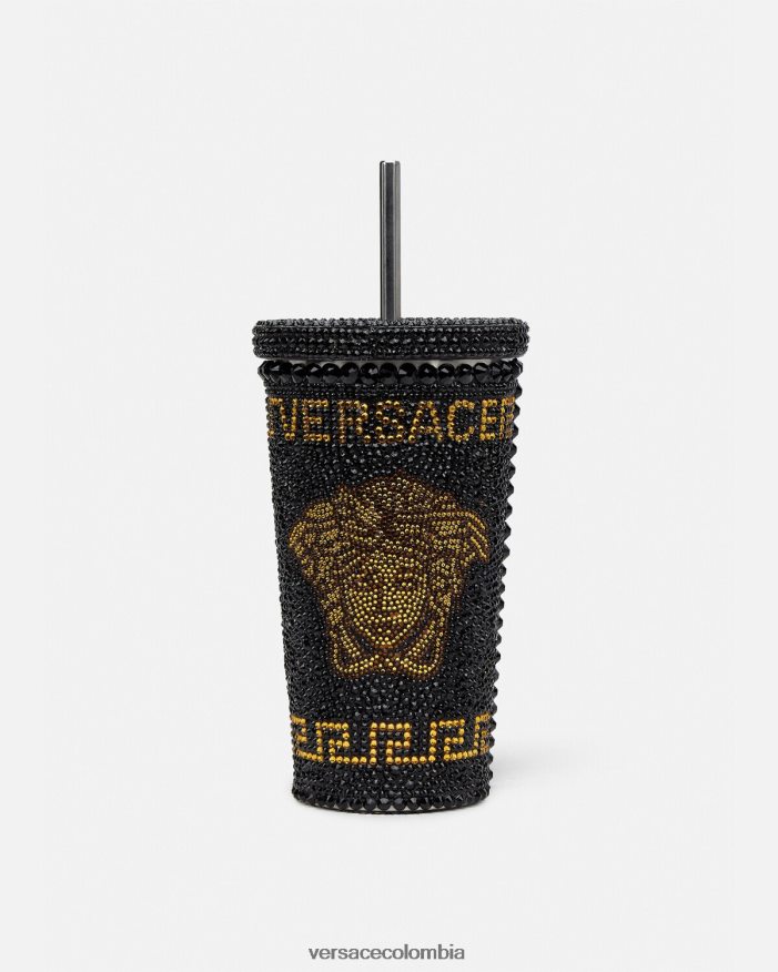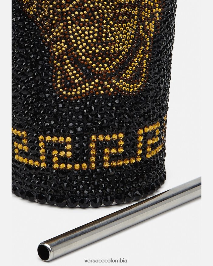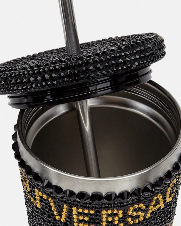 un vaso de viaje de acero inoxidable adornado con cristales y pajita para bebidas frías con motivos de medusa y logotipos.