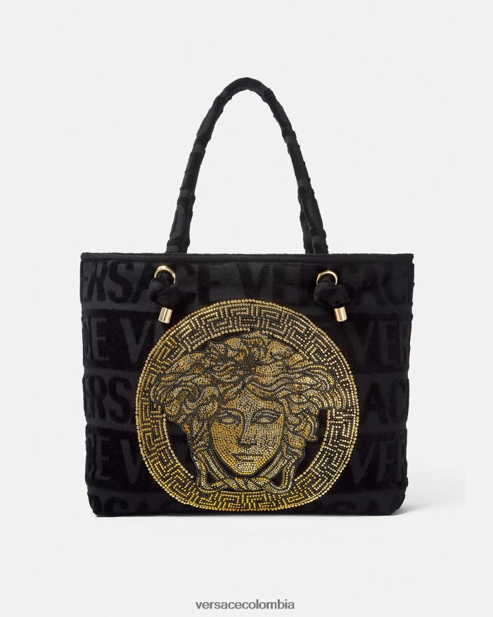 Confeccionado en tejido de toalla, este bolso tote de Versace presenta un logotipo tonal y una medusa adornada con cristales, ideal para guardar artículos esenciales para la playa o la piscina.
