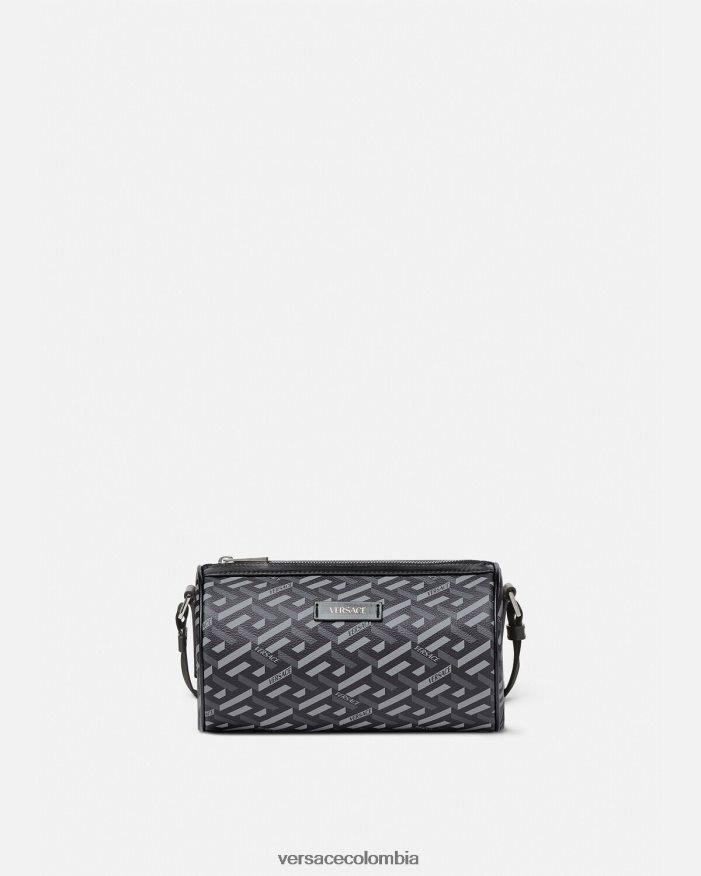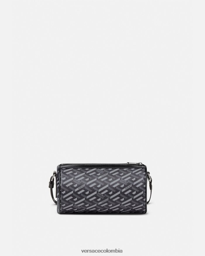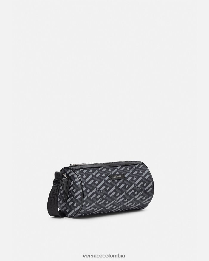 Confeccionado en lona revestida con la firma La Greca, este bolso bandolera tipo barril tiene un diseño cilíndrico con una correa para el hombro ajustable y desmontable de La Greca y un tarjetero adicional.