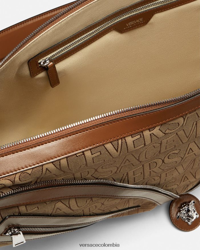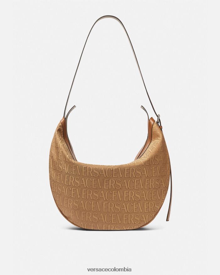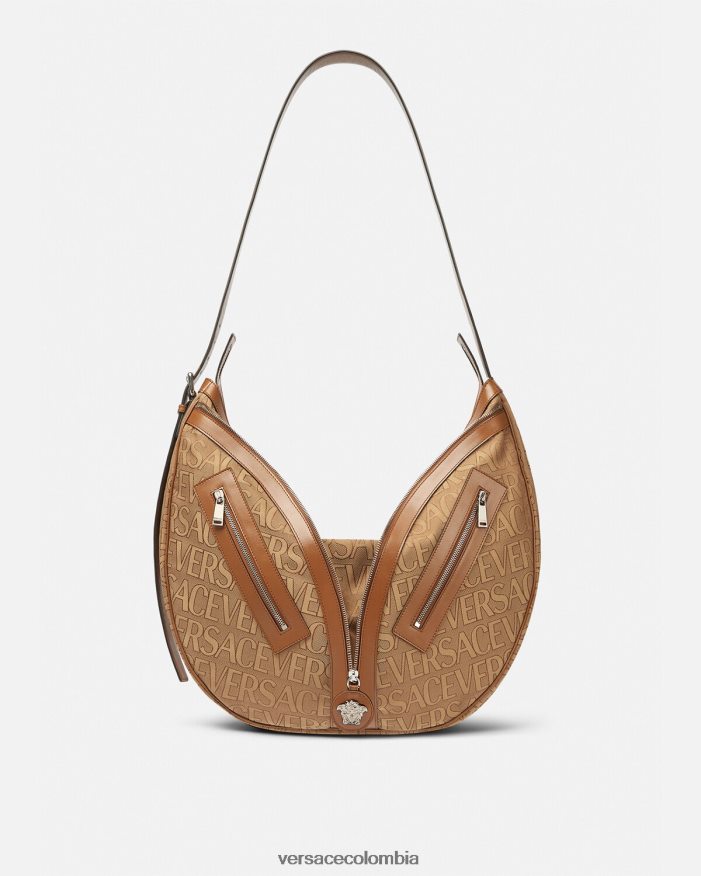 Este bolso de hombro repetido está confeccionado en lona jacquard con el estampado integral de Versace y ribetes de cuero. Una reedición de una silueta hobo de archivo, este estilo espacioso se detalla con un tirador decorativo con colgante de Medusa y bolsillos laterales con cremallera.