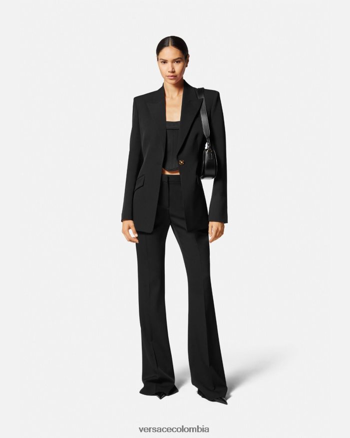 Hombros afilados y entallados aparecen en este blazer de botonadura sencilla con bolsillos laterales angulares, solapa de muesca y un solo botón Medusa.