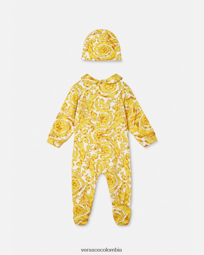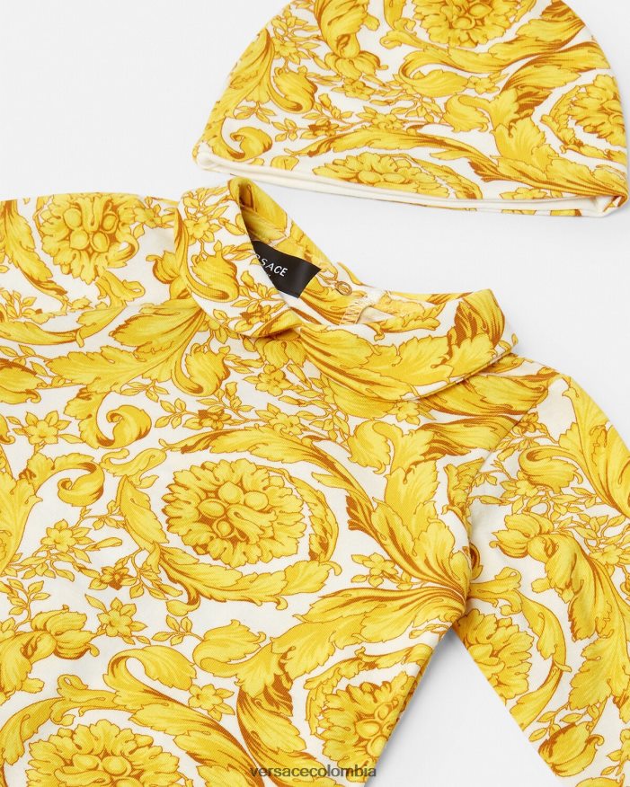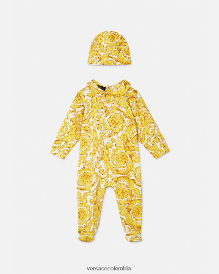 Suave y acogedor, este conjunto para bebé está confeccionado en punto de algodón con estampado barroco. El conjunto suave presenta un pelele con cuello Peter Pan combinado con una gorra a juego.