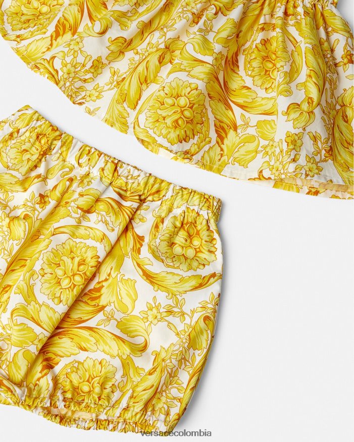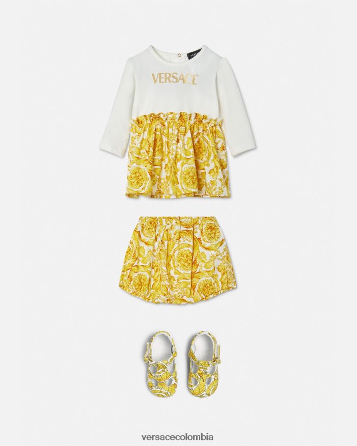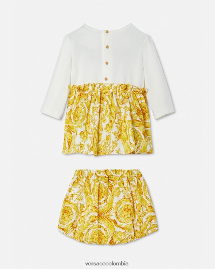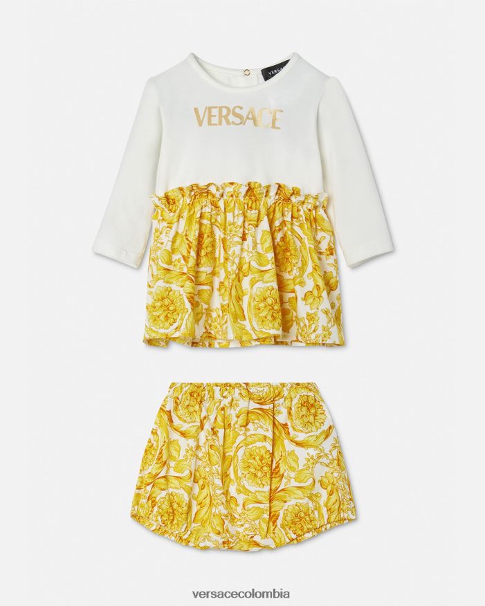 un precioso conjunto caracterizado por el estampado barroco kids en la parte inferior de la falda y el detalle del logo de versace en la parte superior. El juego incluye bombachos a juego.