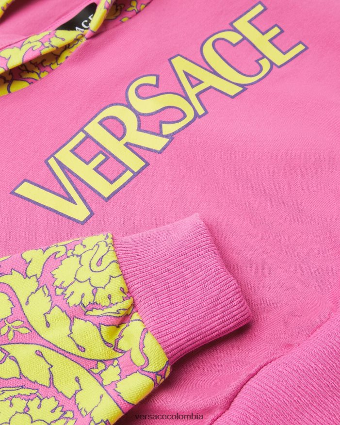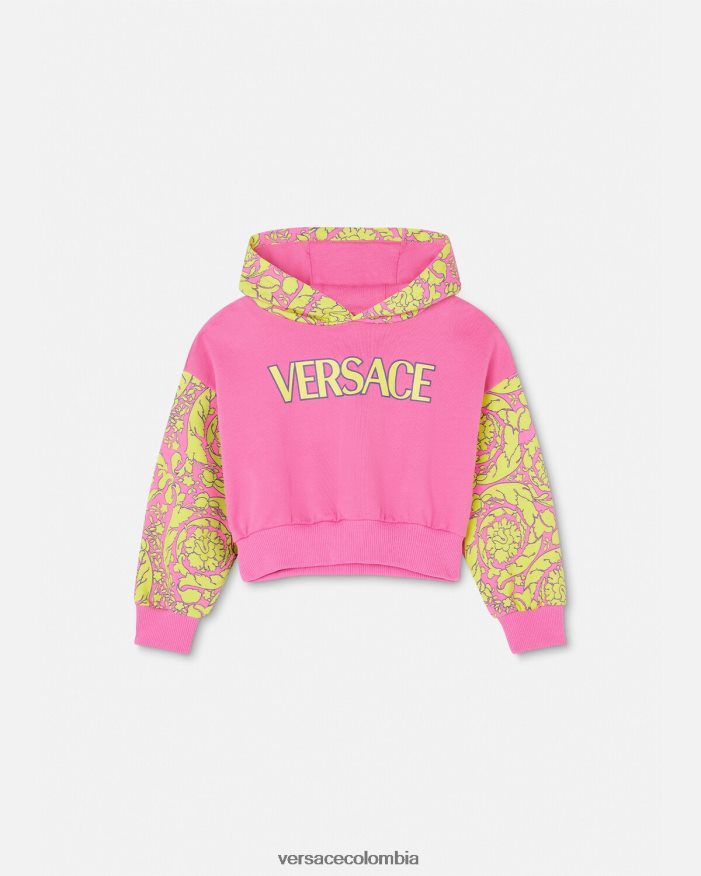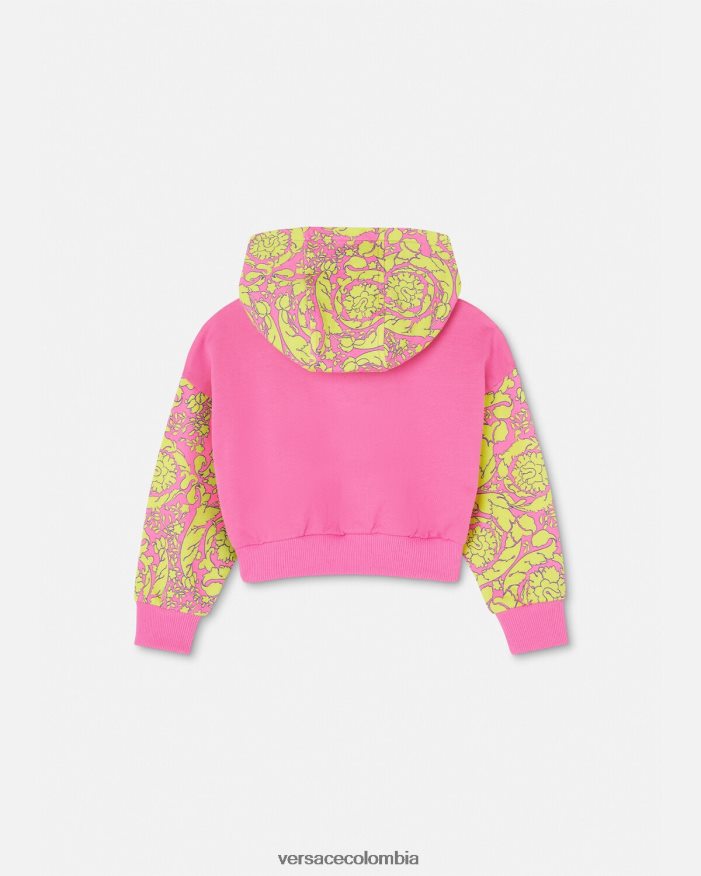 Esta sudadera con capucha está confeccionada con algodón suave y presenta una capucha y mangas con estampado barroco infantil. El diseño está acentuado por un motivo infantil con el logotipo de Versace en la parte delantera.